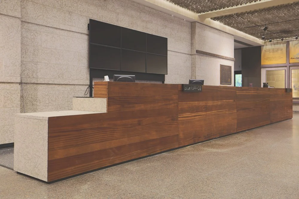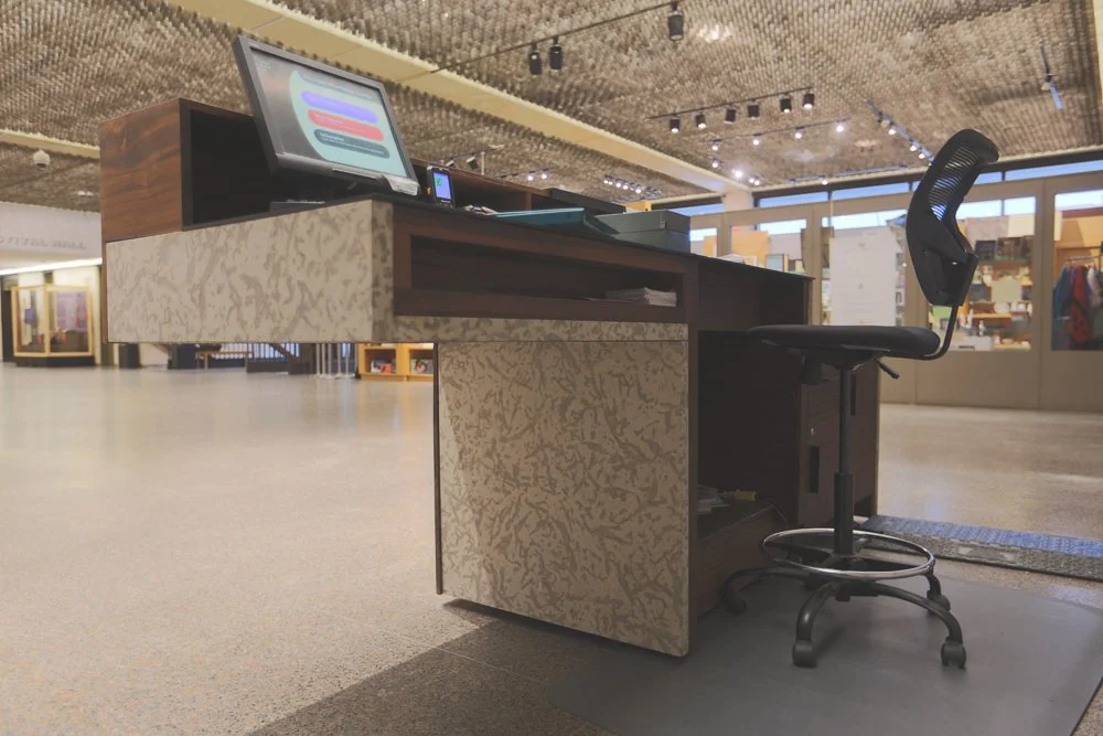 As part of a team effort, I participated in the design and management of the reception desk, following through with fabrication. Trying to keep the design in line with the museum as is, we pulled materials like the Tyndall stone on the back wall and the wood from nearby railings to tie in to the new pieces.